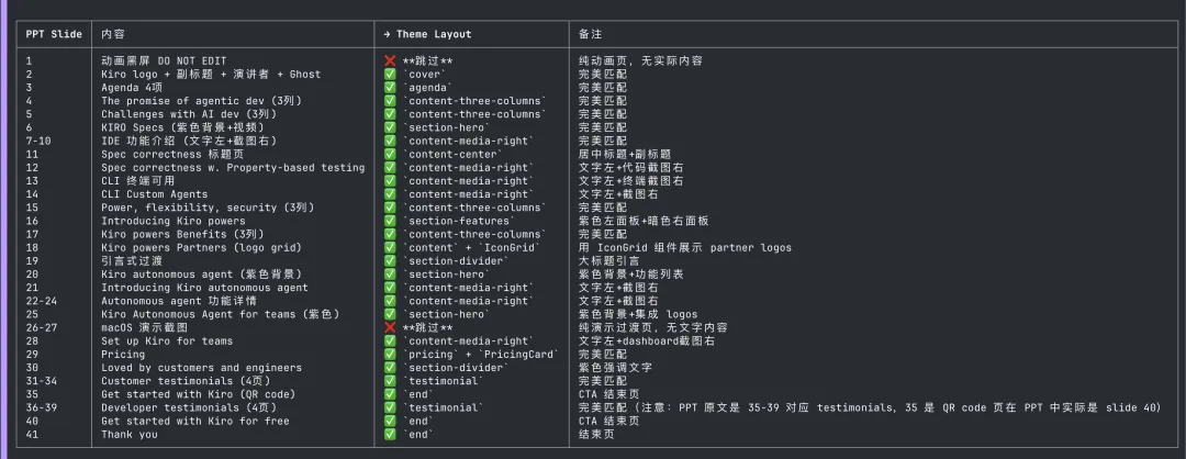 制作主题的时候我是主要靠闭源模型来完成的,主要的原因是 Claude 1M 的上下文和视觉能力。制作主题的时候,我让 Kiro CLI 配合闭源模型读取了整个 PPT, 提取共性的 layout, 生成主题之后,我又让他打开浏览器自己截图,并且和 PPT 的原始排版进行视觉对比。Agent 自己迭代了好几轮。