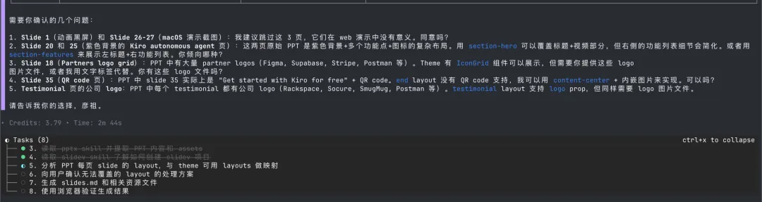一句话在 Kiro CLI 中将 PPT 转化成 Slidev,Agent 自动提取 PPT 中的素材,应用 Kiro 的主题布局和配色,最后生成 Slidev 支持的 Markdown。