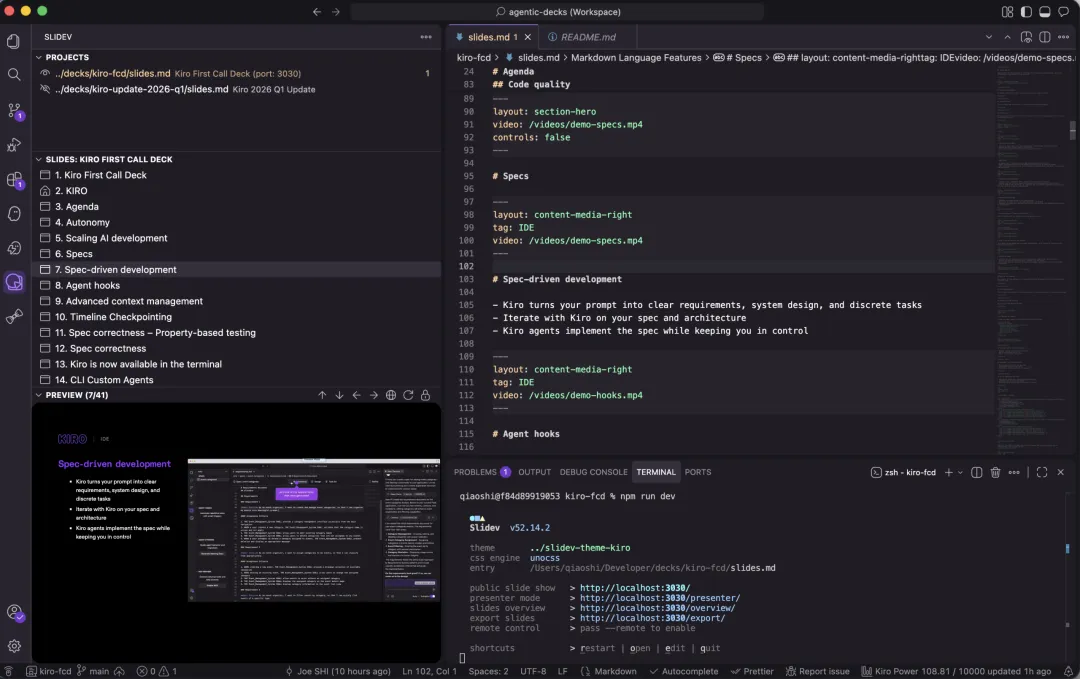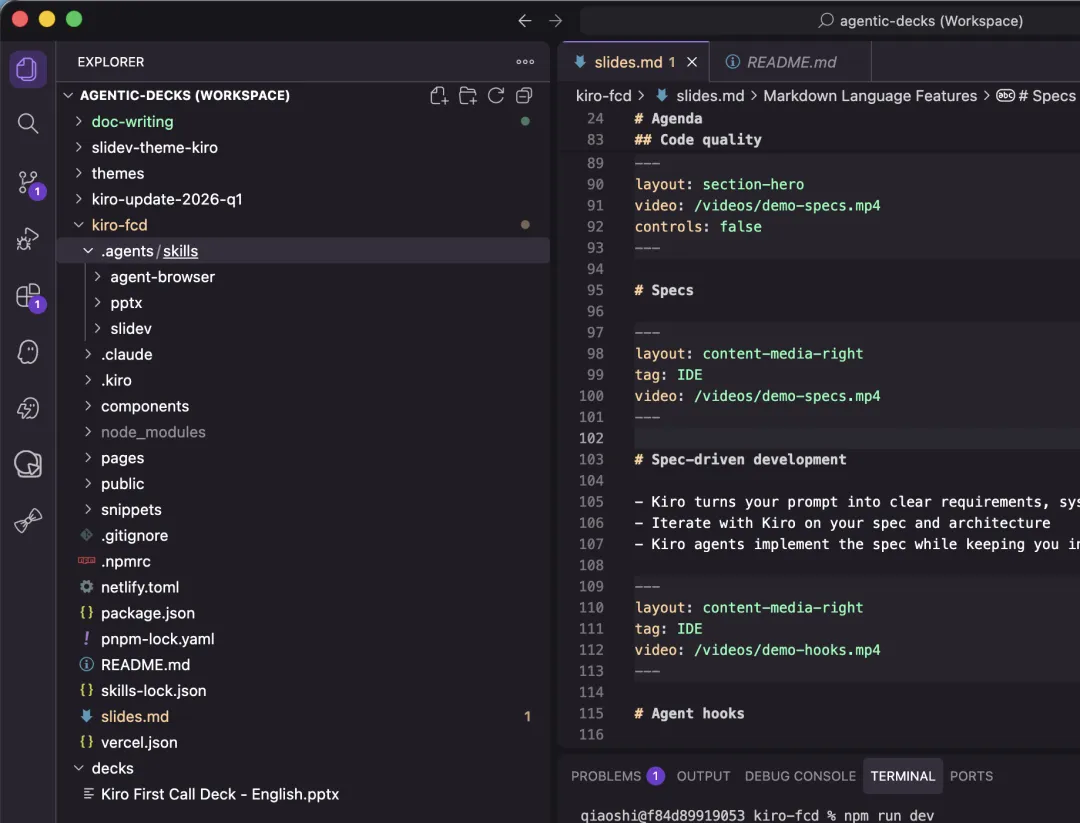 做一个 Kiro 品牌风格的 Slidev Theme,然后让 AI 只负责生成 Markdown 内容,风格由 Theme 统一控制。