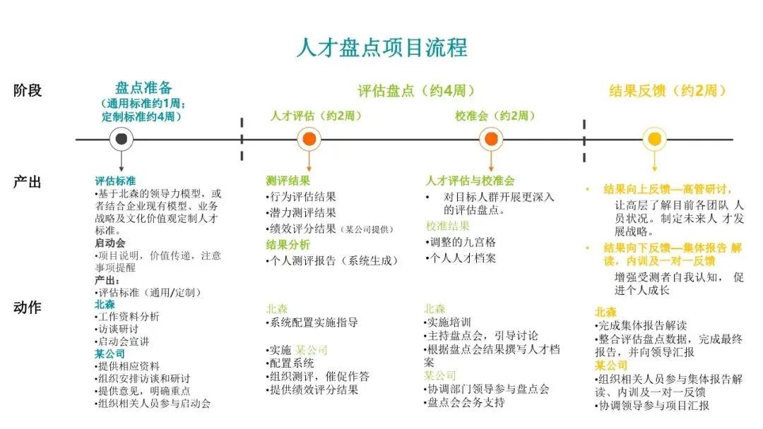 人才盘点工作分为“准备阶段、实施阶段、分析阶段、落地阶段”四个环节,严格按照时间节点推进,确保工作有序高效完成(以年度全面盘点为例)。