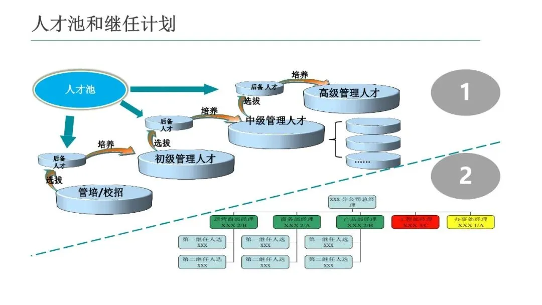 1. 建立后备人才库:筛选高潜力人才、核心人才,纳入公司后备人才库,明确后备人才的培养目标、培养计划及晋升路径;