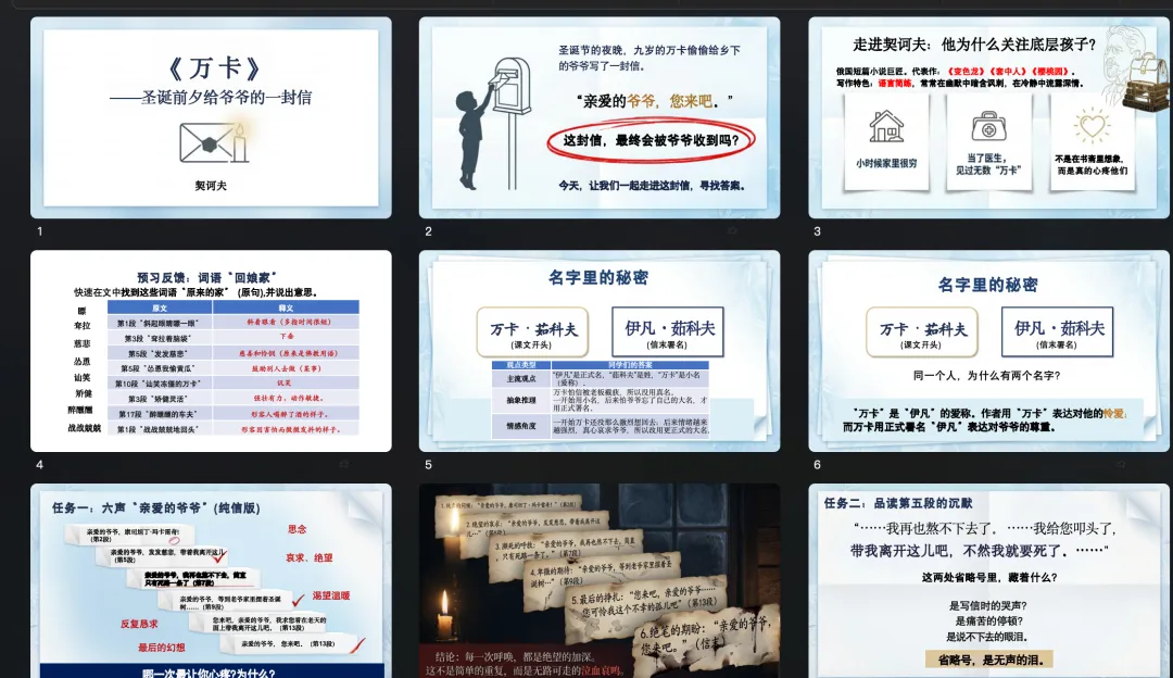 写作特点:注重平凡的生活片段,依靠精巧的细节刻画人物,语言简练,结构紧凑,常常在幽默中暗含讽刺,在冷静中流露深情。《万卡》就是他表达对社会底层劳动者同情的一篇杰作。