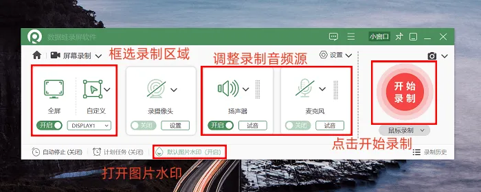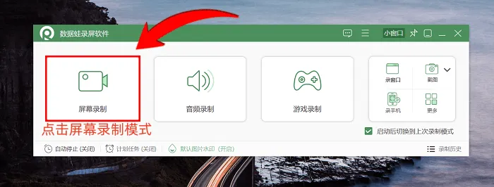 步骤1:运行软件,按自身需求选择对应的录制模式,下方还可按需开启水印设置及自动停止时间配置;