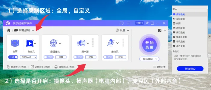 怎么一边讲PPT一边录屏?优加蛙录屏软件采用极简界面设计,三步操作即可完成视频录制,对电脑操作不熟练的用户十分友好。软件内置版权保护机制,录制完成后可添加个性化水印,有效防止视频被盗用。为提升用户从录制到创作的整体效率,软件整合了多种实用工具与基础编辑功能。