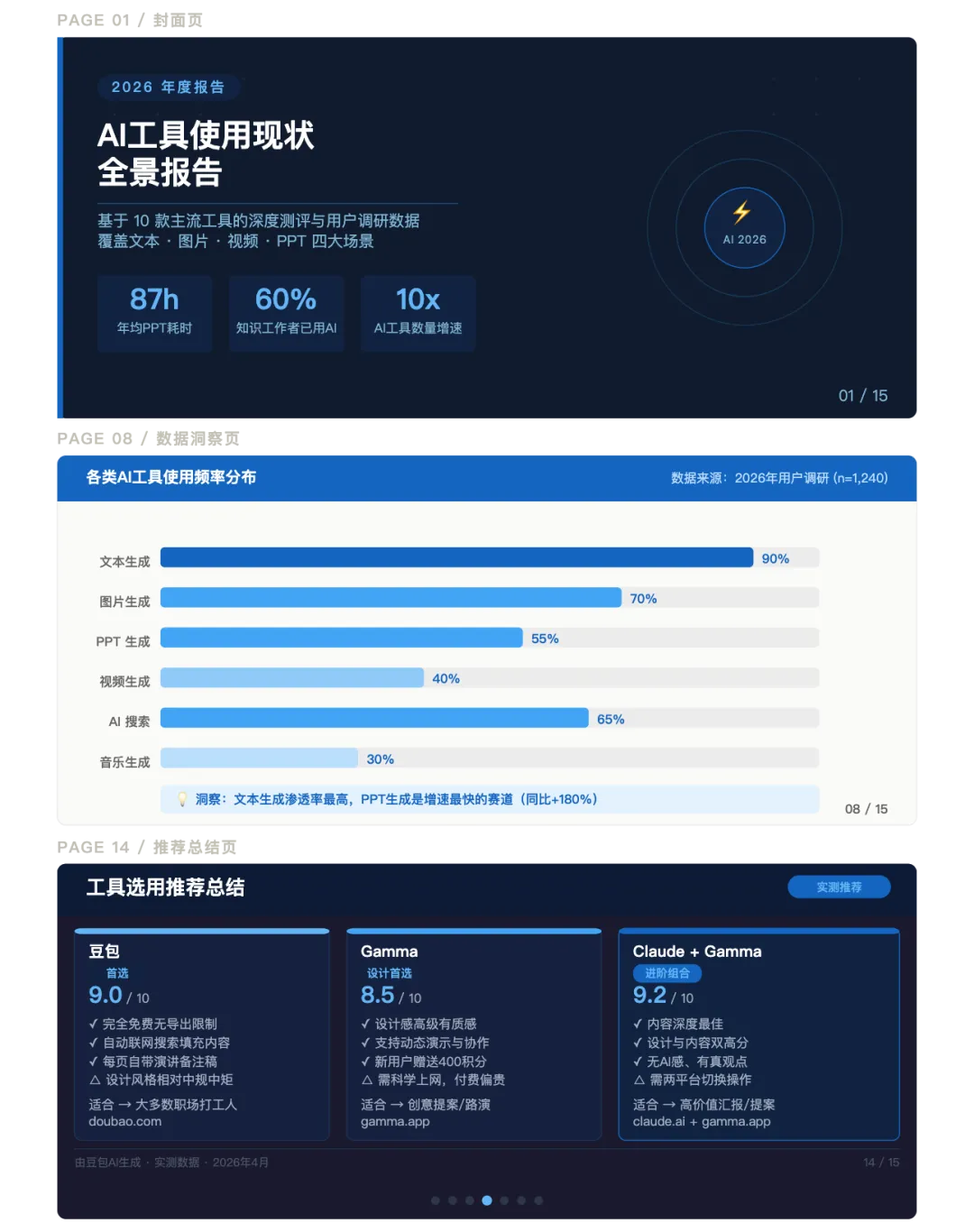 以上是用豆包实际生成的PPT中3页截图(封面页、数据洞察页、推荐总结页)。可以看到整体风格工整、逻辑清晰,内容自动联网填充,备注栏有逐字演讲稿——这是完全免费、0门槛生成的结果。