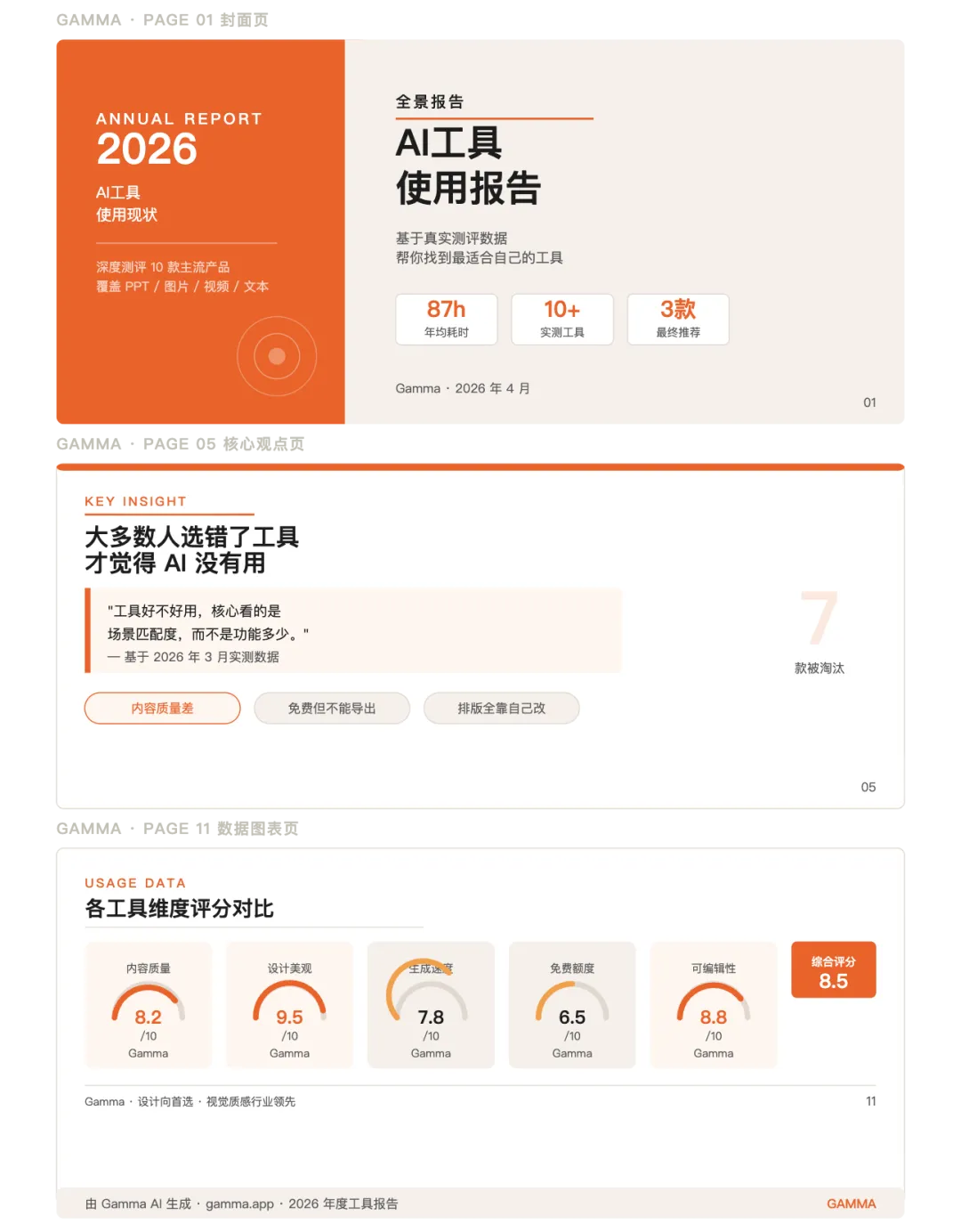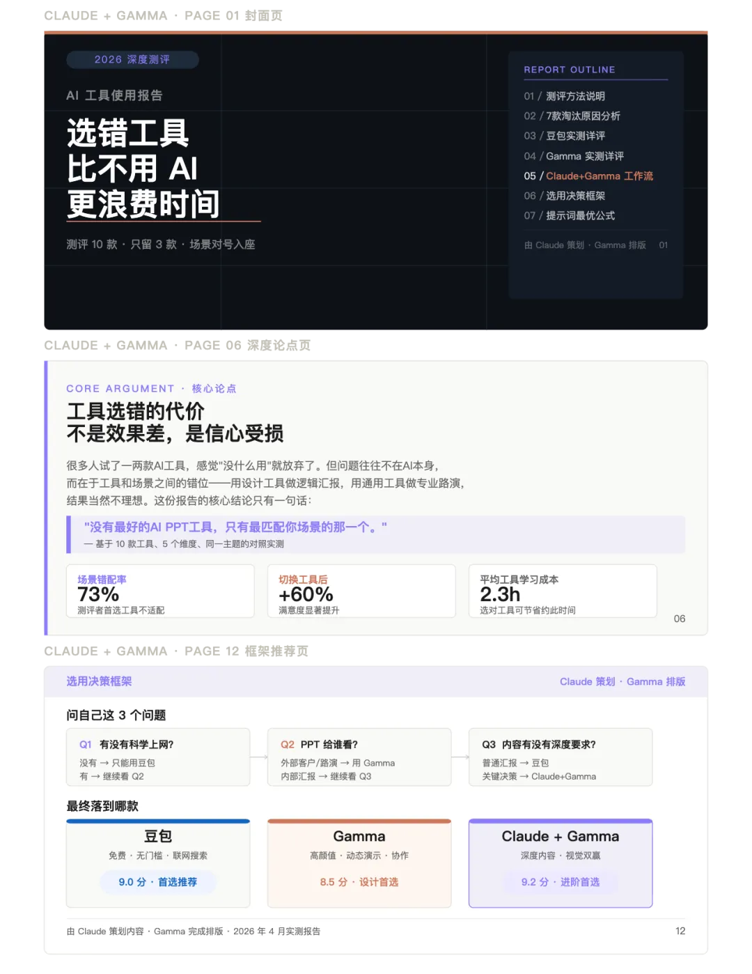 Claude + Gamma 组合风格 — Claude 负责深度内容与观点,Gamma 负责排版呈现,整体更有"作者感",信息密度高、论点清晰