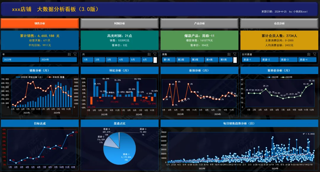 PS.本章节内模板均为已搭建设计好的,对应模板视频教程请参考。一句话概要:运用excel基础技能,实现销售数据可视化分析(WPS可)(分析内容:各月分析 、产品分析、环比分析、占比分析、趋势分析、时刻分析)02-XX公司大数据分析(含目标)一句话:运用excel基础技能,实现销售数据可视化分析(WPS可)(分析内容:各月分析 、达成分析、排行榜分析、员工排行分析、环比分析、趋势分析)03-多维度店铺运营大数据分析-3.0版(WPS可)维度2:时刻分析