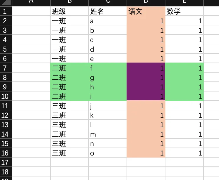 紫色部分为 二班的语文成绩,这个部分的数据就是二班的所有数据和语文的所有数据的交集。