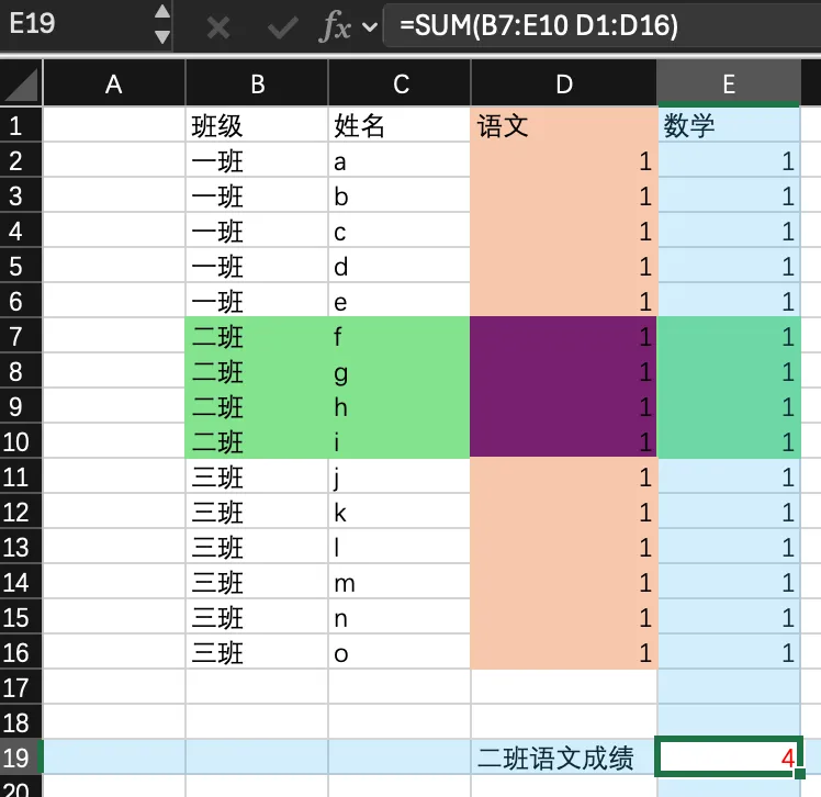 这个公式和我们平时常用的求和公式的区别在于,两个数组区域中间不是用逗号隔开,而是用空格隔开。这个空格的作用就是取相邻两个区域的交集部分,也就是图2中紫色部分的区域。