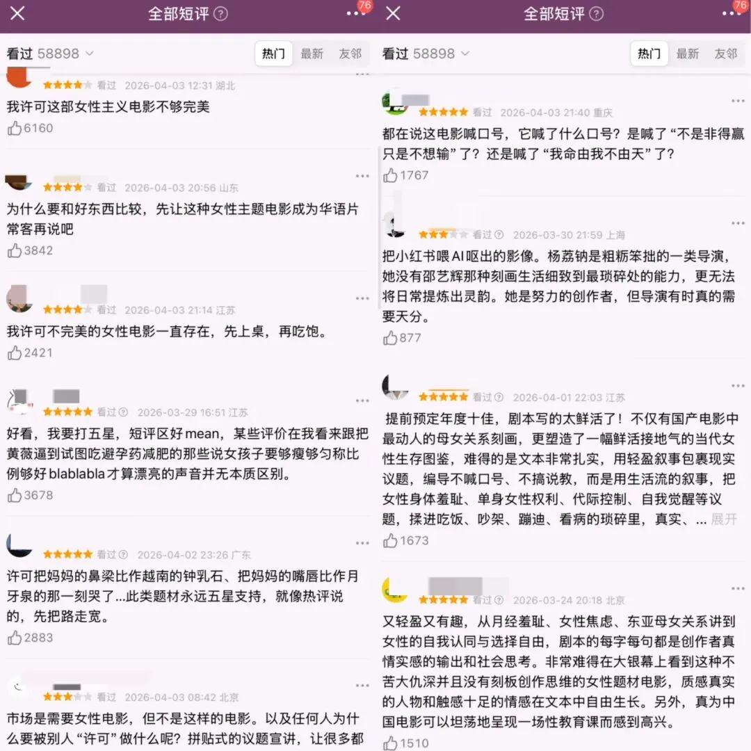 奇怪的是,骂归骂,观众还是走进电影院,打出高分,在评论区写下:“我许可这部女性主义电影不够完美。”