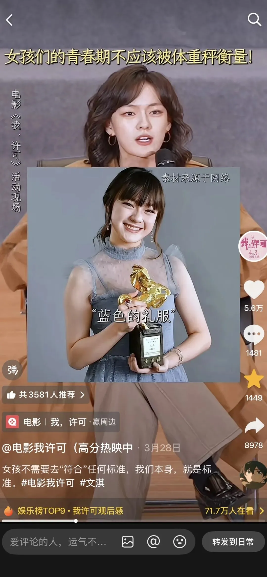 饰演许可的文淇,后来反复提起,她对这一幕感同身受。2017年,14岁的她穿着蓝色礼服站在金马奖领奖台上,照片出来后,网上开始说她是“胖女孩”。