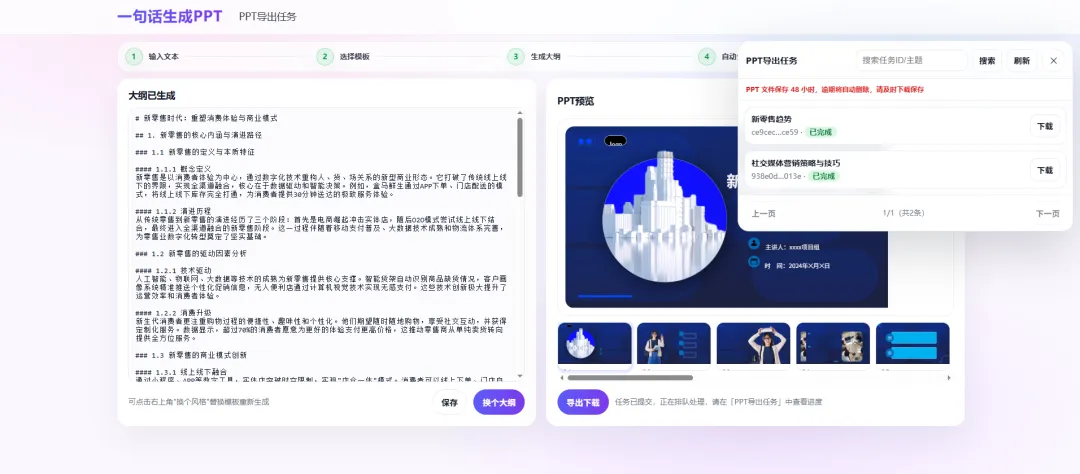 一句话生成PPT,自动排版输出,页面及功能均为AI完成。