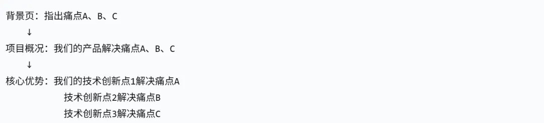 一个容易被忽视但至关重要的细节:项目概况和核心优势必须与背景页形成逻辑闭环。检查方法:拿出你的背景页,看看列出的每一个痛点,在核心优势模块是否有对应的技术点来“回应”。如果有痛点没有回应,说明你的方案有漏洞。材料案例(脱敏):某项目的背景页列出了三大痛点:“进口依赖、检测速度慢、成本高”。核心优势的三个创新点分别对应:“自主研发核心部件(解决进口依赖)”、“优化算法提升速度X倍(解决速度慢)”、“创新工艺降低成本X%(解决成本高)”。评委看完,感觉这个团队是“带着问题做研发”,而不是“拿着技术找应用”。05 一页核心优势的完整结构示例
