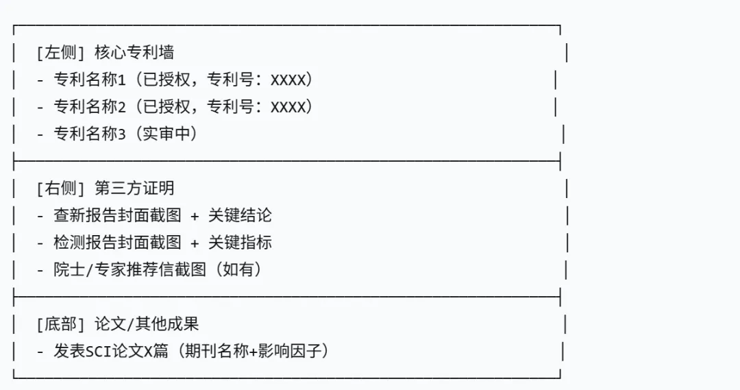材料案例(脱敏):某材料项目,三个创新点各占一页。每页的结构是:顶部是大标题(如“创新点一:独创XX配方”),中间是一张原理示意图(展示材料微观结构变化),底部是一张对比柱状图(传统材料性能 vs 新材料性能),旁边标注“经XX检测中心测试”。评委看完三页,对技术壁垒有了清晰认知。3.3 支柱二:知识产权与证明(建立证据链)