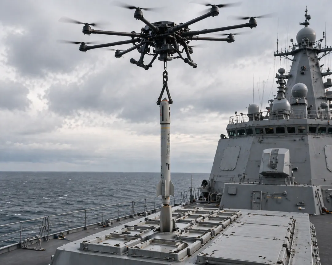 据防务网站“海军新闻”(Naval News)报道称,印度海军最近发布了一则关于“使用无人机进行海上再装填”(Rearming by Drone)的“问题陈述”,其内容旨在开发一款“用于为海上舰艇垂直发射装置装填舰空导弹”的多旋翼无人机。