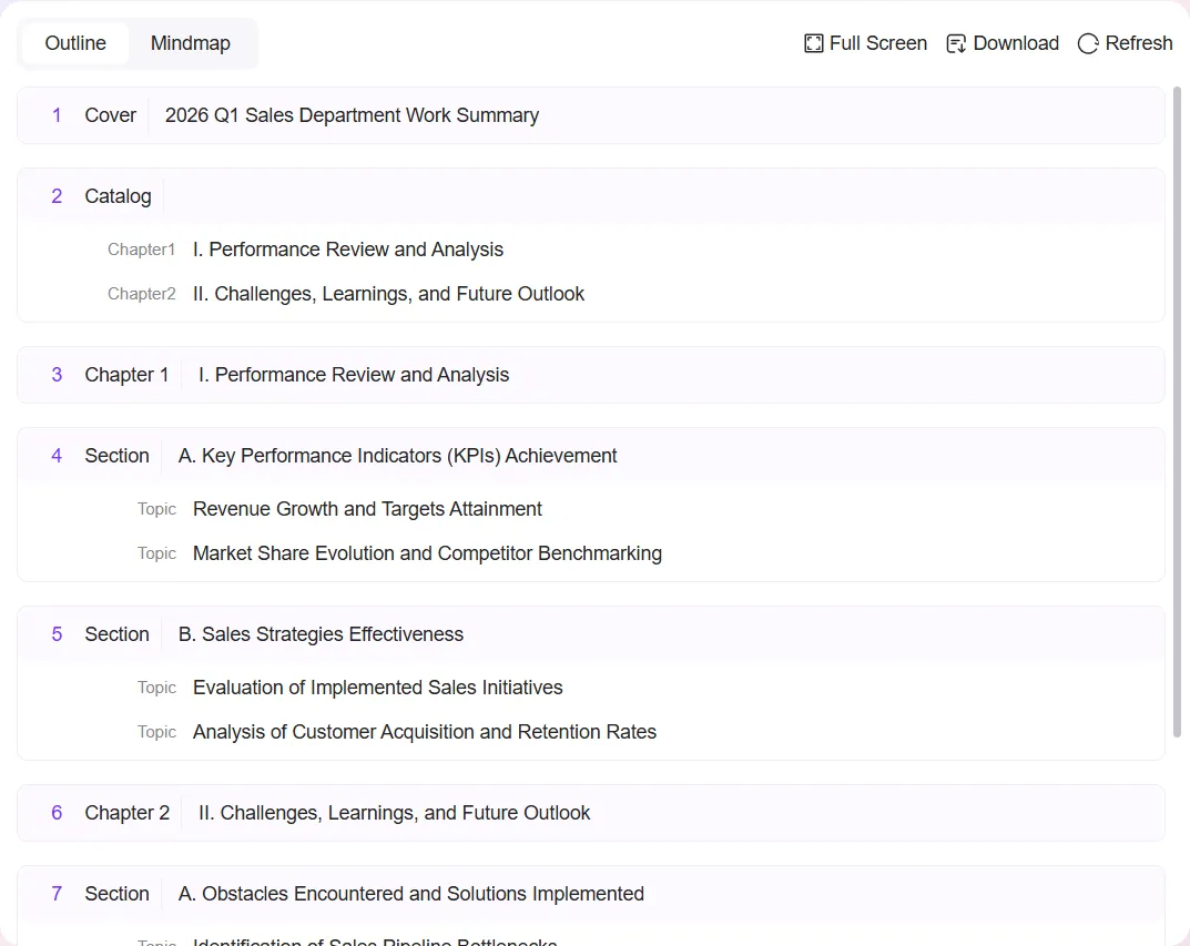 AI在10秒内会给出一个详细的大纲。包括了:本季度业绩回顾、市场分析、存在问题、下季度计划。