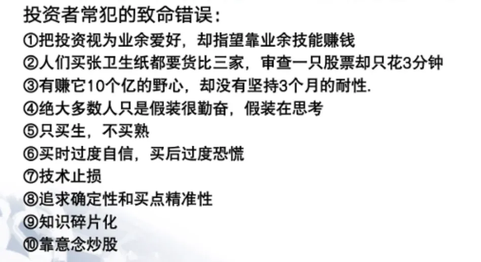 PPT 里列了散户常犯的 10 个致命错误,最扎心的一条是:把投资视为业余爱好,却指望靠业余技能赚钱