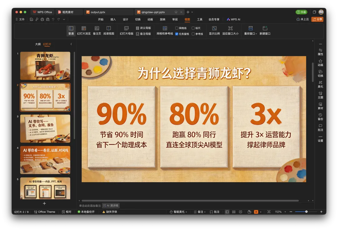 青狮龙虾对接大模型整体来看,现在状态是:安装器稳了,PPT大师有了,合同审核和辩护词方向明确了,多模型支持让成本更灵活。节奏感很好,继续往下走就行。