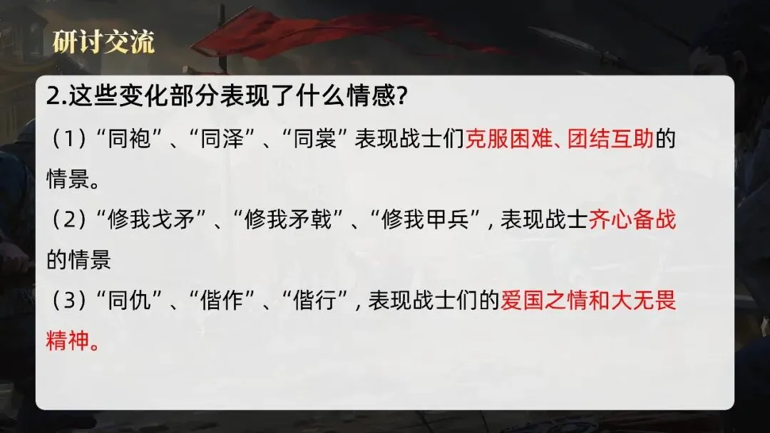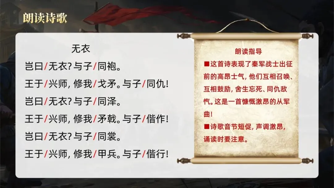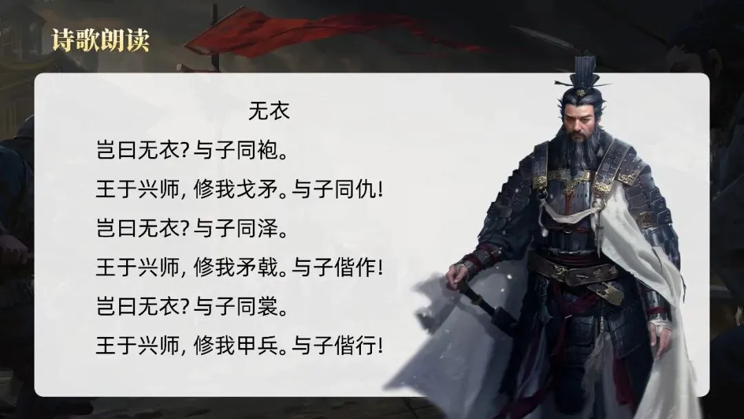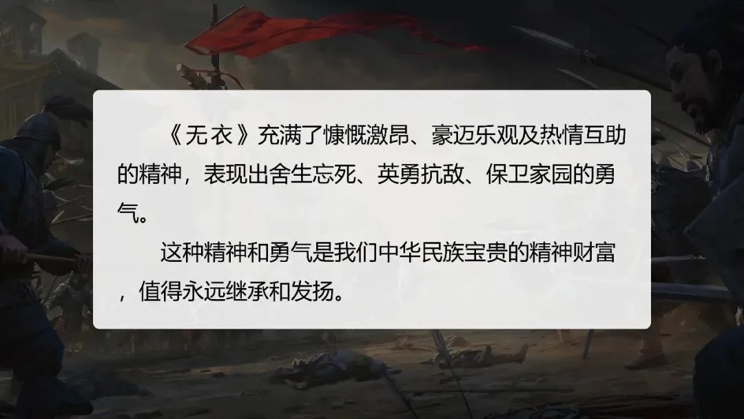 本期更新的课件为统编高教社版中职语文基础模块上册第三单元《无衣》,共24页。