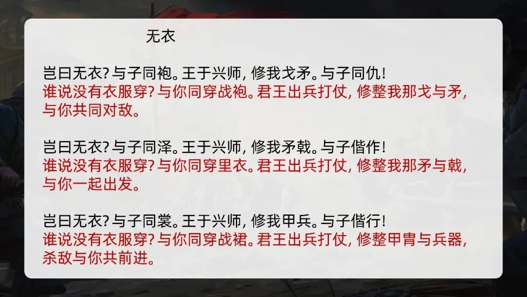 本文是《诗经·秦风》中的军歌名篇。诗歌以"岂曰无衣?与子同袍"的豪迈反问起笔,通过重章叠句的形式,表现秦国军民团结友爱、同仇敌忾、慷慨从军的爱国精神。"修我戈矛,与子同仇"的誓言铿锵有力,"修我甲兵,与子偕行"的决绝气壮山河。全诗节奏短促,情感激越,是《诗经》中最富英雄气概的战歌,体现了中华民族保家卫国的优良传统。
