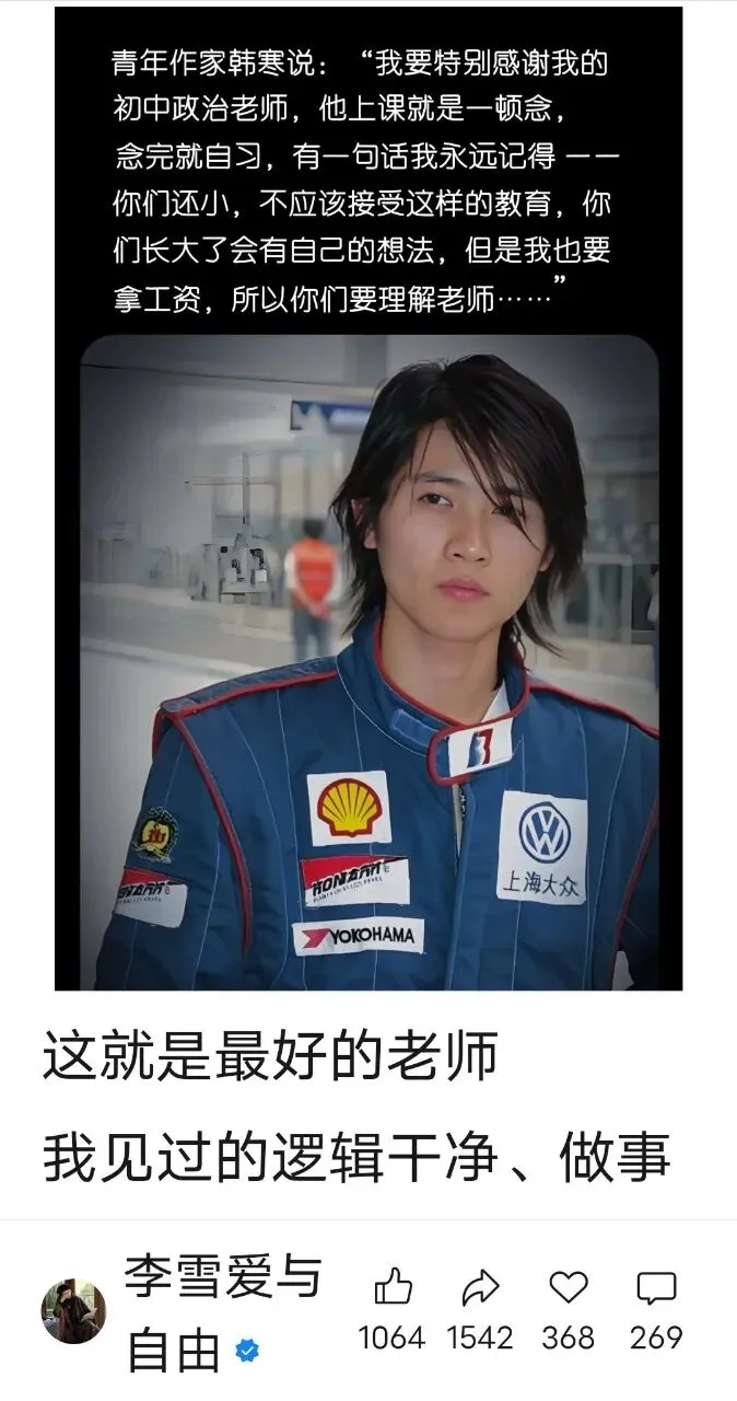 前些天在心理学者李雪老师的公众号贴图里,看到一张青年作家韩寒的旧照。配文里,韩寒回忆起那位让他记一辈子的初中政治老师: