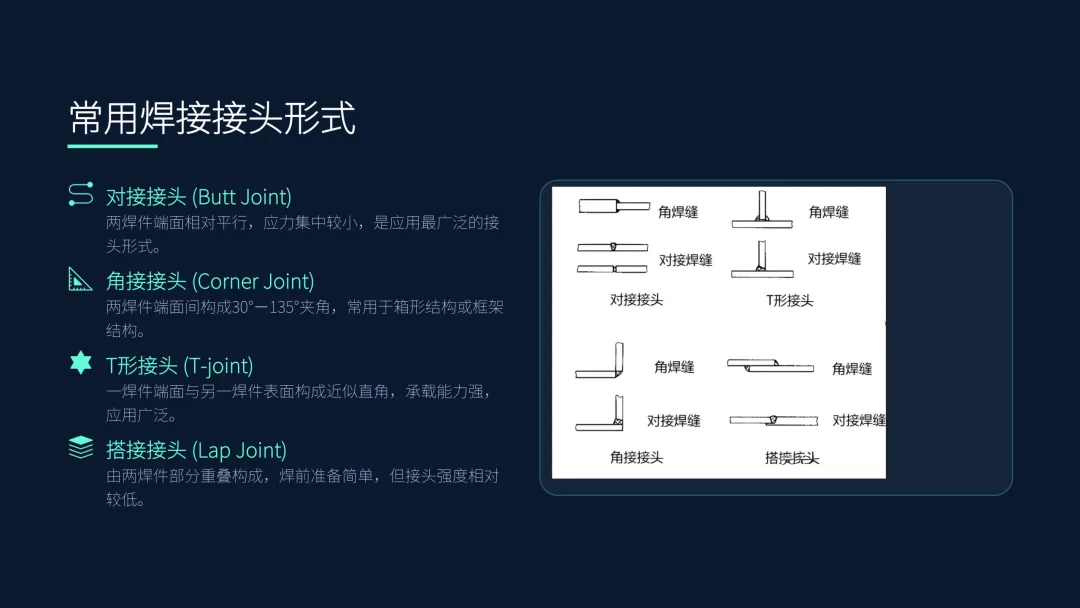 定义:一焊件端面与另一焊件表面构成近似直角,应用频率仅次于对接接头。 适用场景:梁柱连接、支架焊接等。 实操重点:板厚<3mm的T形接头可不开坡口;十字接头本质是两个T形接头的组合,要注意焊缝交叉处的应力分散,避免开裂。