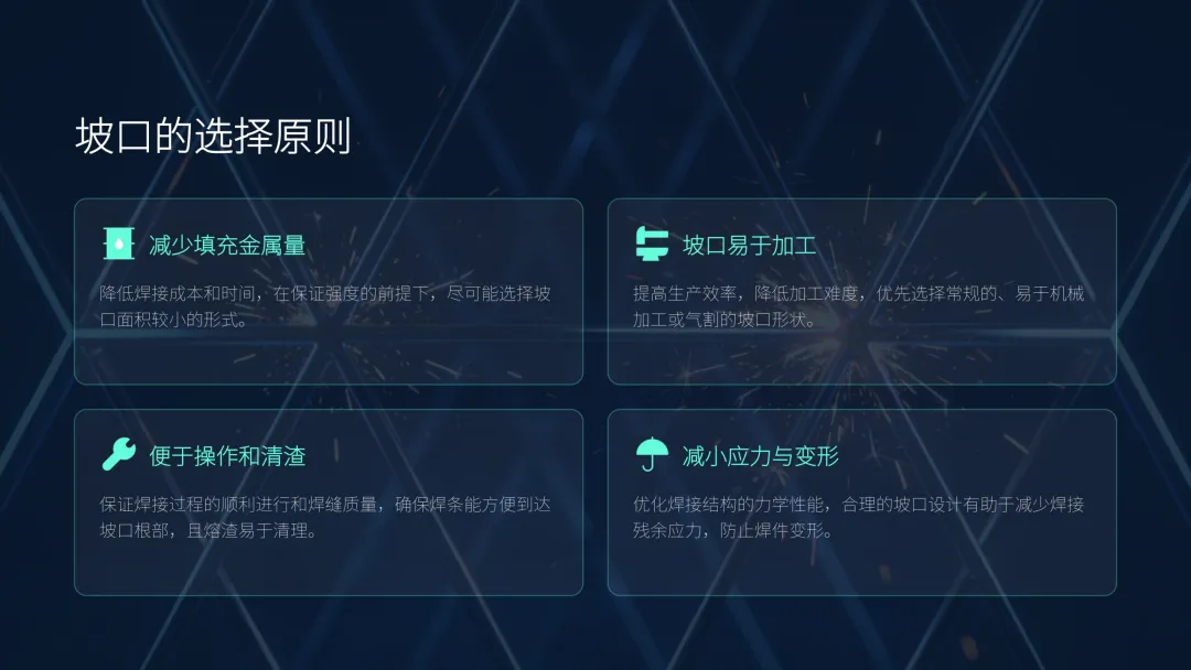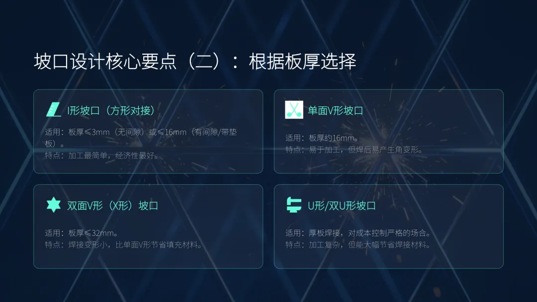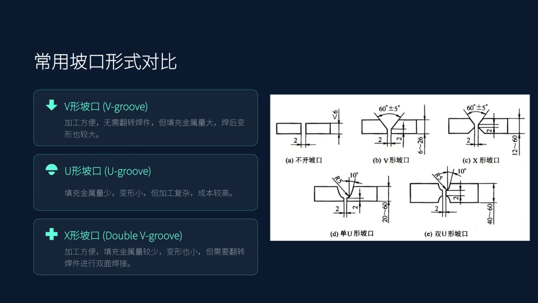 生产中选坡口,记住“降本、高效、易操作、减变形”4个核心原则,结合母材厚度、焊接方法,重点关注这4点: