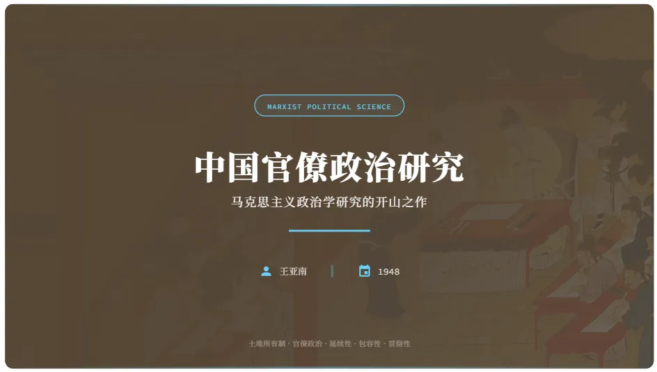 王亚南的《中国官僚政治研究》通过马克思主义政治经济学的分析框架,揭示了中国传统官僚政治的本质特征、历史延续性及其对中国社会长期停滞的影响。该书将"李约瑟难题"转化为一个关于中国社会经济结构的系统性问题,揭示了官僚政治与封建地主经济的共生关系如何阻碍了中国社会向近代化的转型。在当代中国语境下,王亚南的著作仍具有重要启示,为理解中国社会变迁提供了理论工具,至今仍具强大的解释力和启发性。