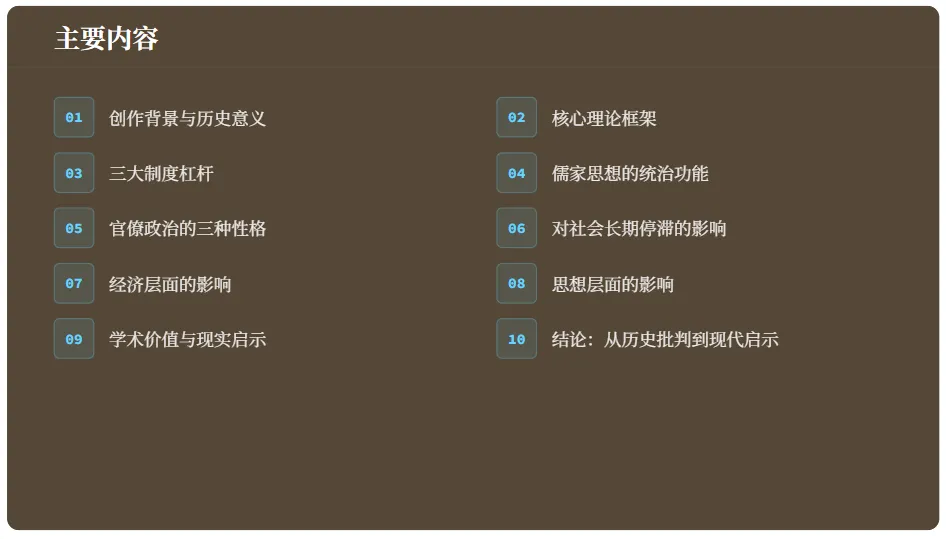 - 科举制:始于隋唐,通过垄断儒家经典阐释权,将知识分子转化为官僚集团成员,消解了社会批判力量,形成了"开放型等级制"。