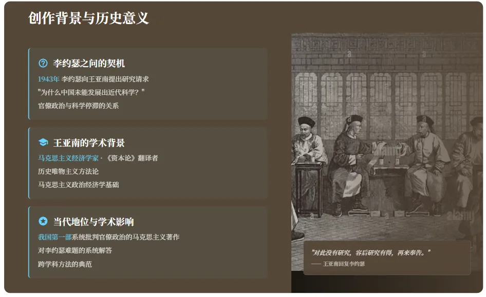 1943年,英国科学史家李约瑟访问广东时,向王亚南提出了关于"中国官僚政治"的研究请求,希望他从历史与社会角度解释中国官僚政治的延续性。这一问题促使王亚南开始系统思考中国官僚政治的本质与规律。李约瑟的提问源于其对中国科技史研究的困惑,他认为中国官僚政治对商人阶级的压制和对商业利润的系统性剥夺,导致中国未能催生出近代科学和工业革命。