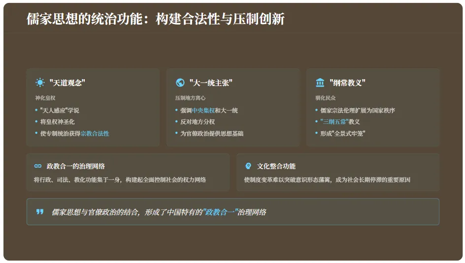 - "纲常教义":驯化民众,形成思想领域的"全景式牢笼",使百姓敬畏自卑、安分守己。