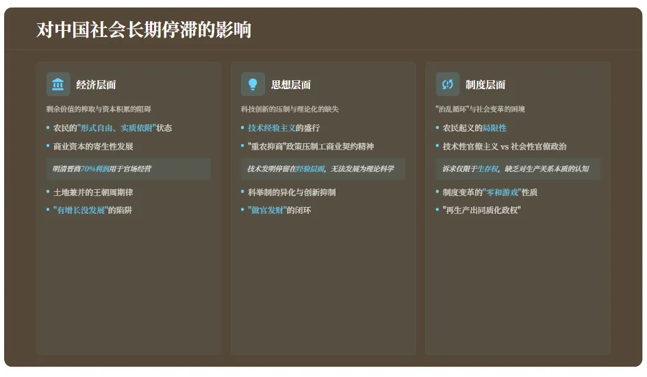 - 官营工商业:通过控制盐铁等关键行业,将巨额利润收归官府,阻碍了工商资本的独立发展,导致技术创新缺乏市场化激励。