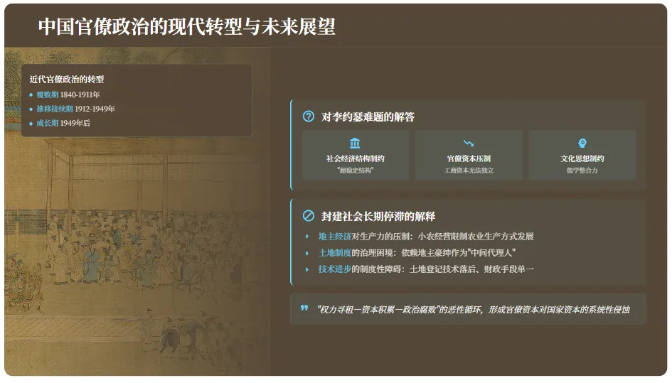 官僚政治下,农民处于"形式自由、实质依附"状态,商业资本寄生性发展,土地兼并形成王朝周期律。商人阶层无法形成独立的经济力量,其资本积累必须依附于官僚体系,导致"有增长没发展"的陷阱。