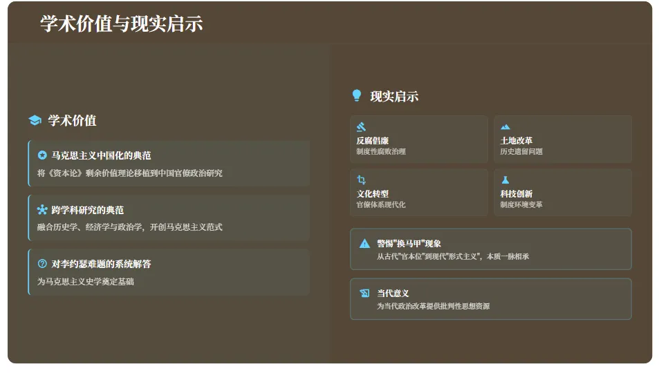 《中国官僚政治研究》将《资本论》的剩余价值理论移植到中国官僚政治研究,揭示了官僚阶层作为特殊利益集团的寄生性,为马克思主义中国化提供了重要案例。该书融合历史学、经济学与政治学视角,开创了中国官僚政治研究的马克思主义范式。