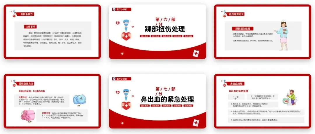 急救知识宣传讲座PPT强调,按压过程中不可频繁松开查看是否止血,持续的按压才能达到有效的止血效果,同时可配合冷敷鼻梁部位,辅助收缩血管止血。