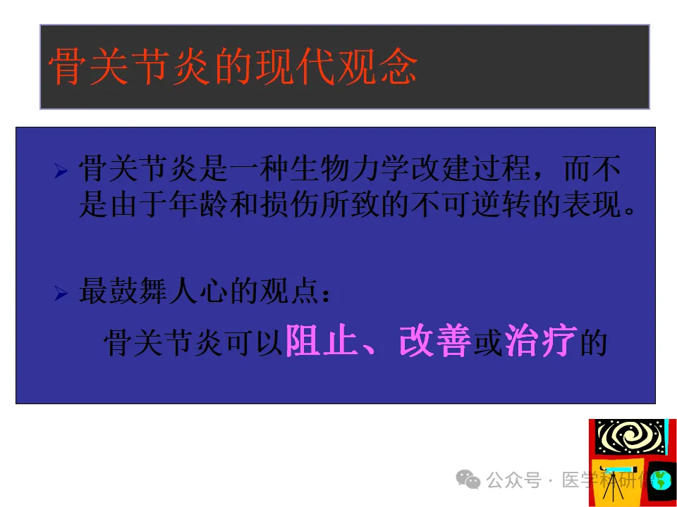 在现代医学中,骨关节炎被视为一种生物力学改建过程,而非简单的磨损性疾病。这一观念强调,通过合理的治疗和管理,骨关节炎的病程是可以被阻止、改善甚至逆转的。这为骨关节炎的治疗提供了新的思路和方向。