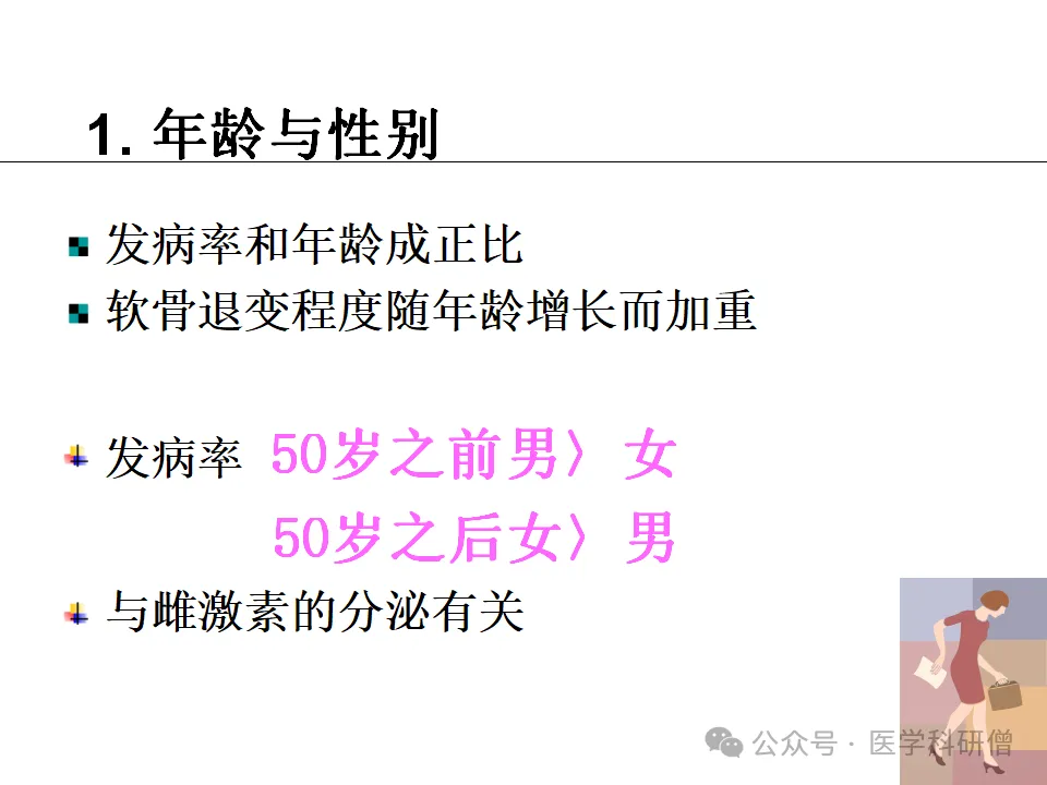 1. 年龄与性别:随着年龄的增长,骨关节炎的发病率逐渐增加。同时,性别差异也与骨关节炎的发病有关,女性患者较多,这可能与雌激素分泌减少有关。
