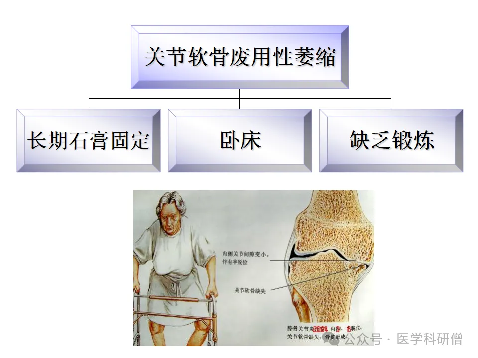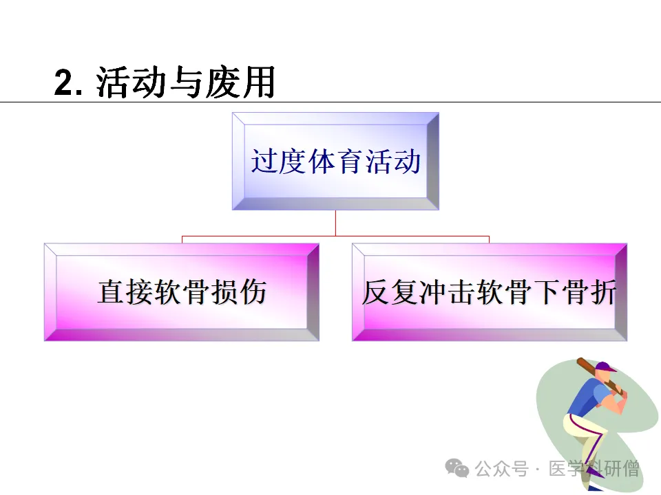 2. 活动与废用:过度体育活动和关节的长期废用都可能导致骨关节炎。过度使用关节会加速关节软骨的磨损,而长期废用则可能导致关节软骨的废用性萎缩。