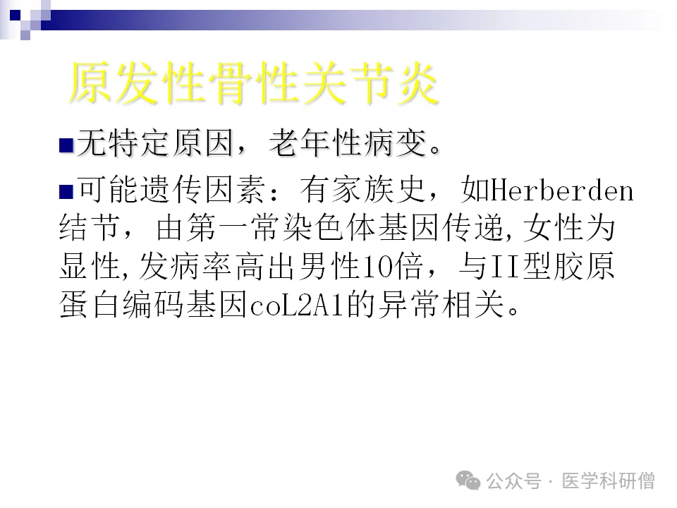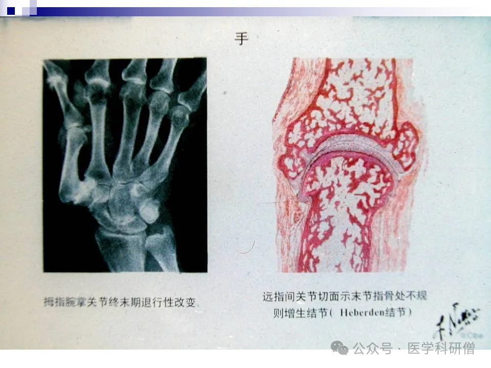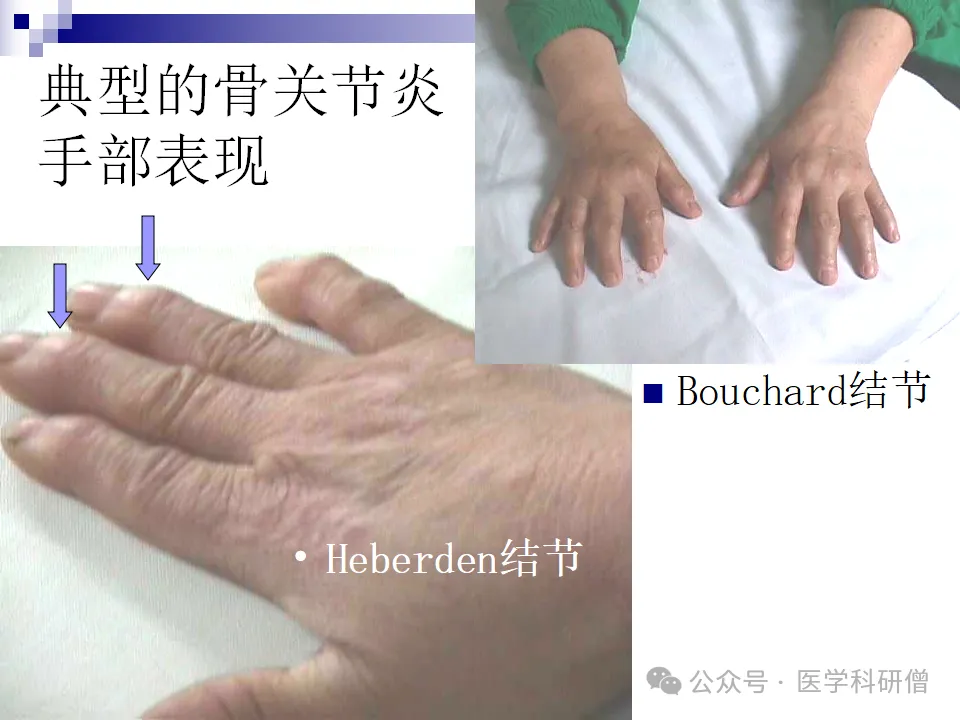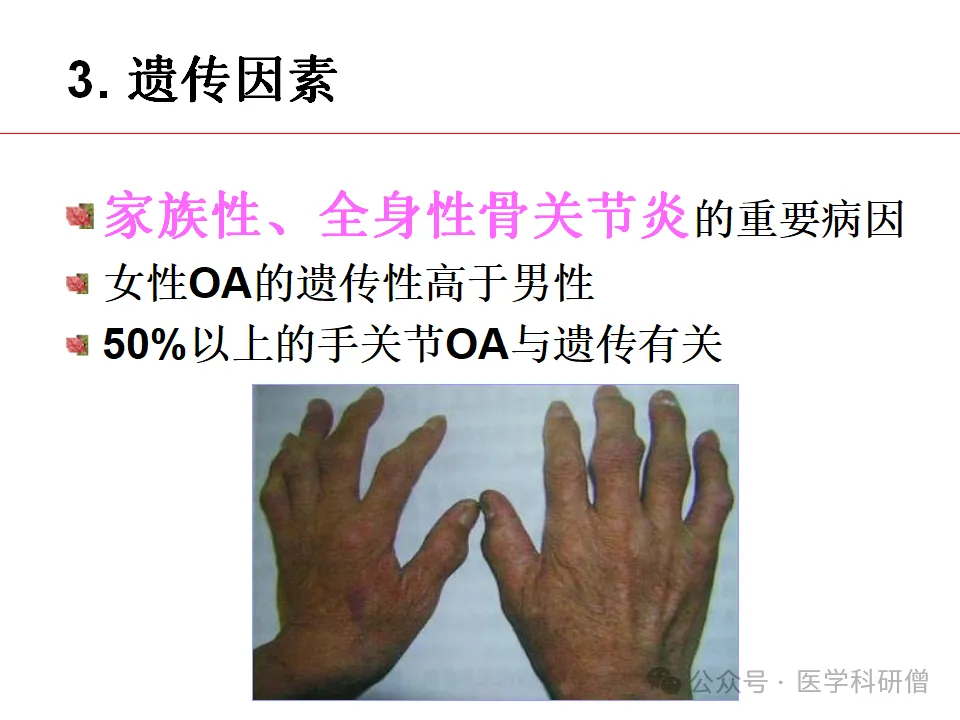 3. 遗传因素:家族性和全身性骨关节炎的重要病因之一,如Herberden结节就与遗传因素密切相关。