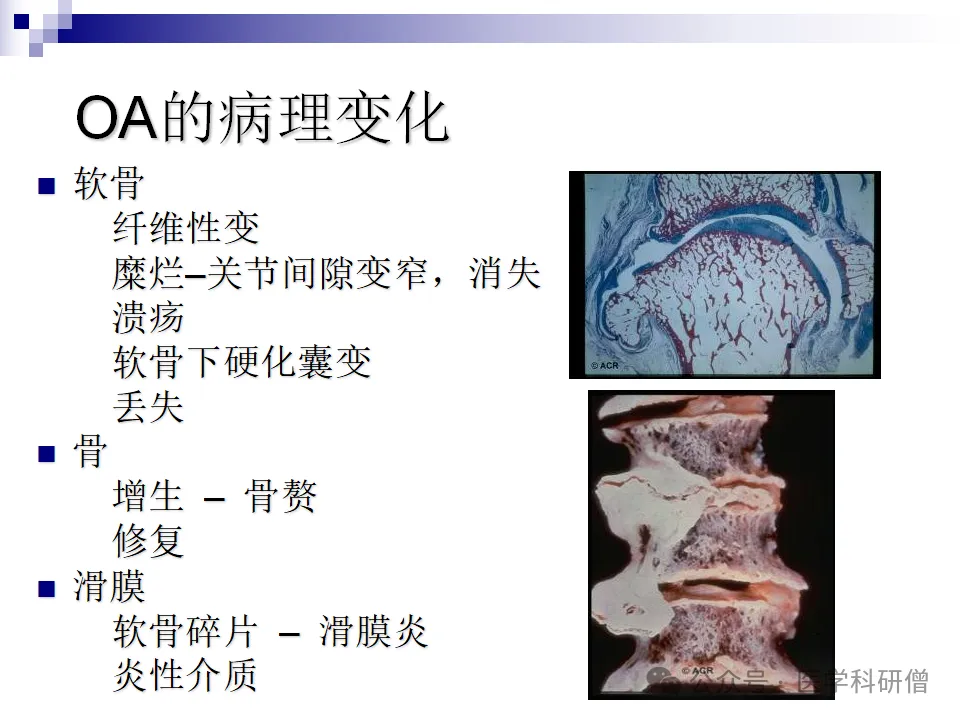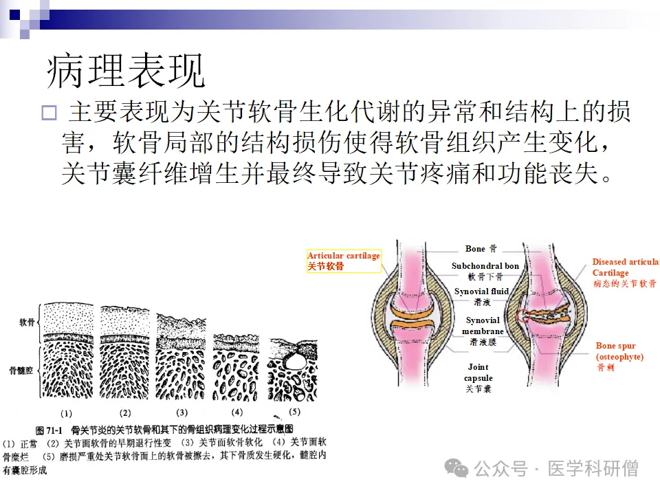 骨关节炎的病理过程涉及关节软骨的生化代谢异常和结构损害。在病理变化方面,骨关节炎主要表现为软骨的纤维性变、糜烂、溃疡以及软骨下硬化囊变和丢失。同时,骨也会出现增生和修复的反应,形成骨赘等结构。此外,滑膜也会因软骨碎片和炎性介质的作用而发生滑膜炎,进一步加剧关节的炎症和疼痛。
