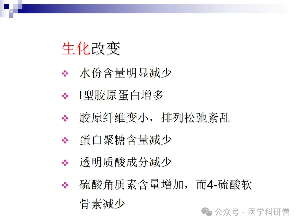 在骨关节炎中,软骨的改变尤为显著。形态上,软骨会失去均一性,变薄并出现糜烂、凹陷、裂开和溃疡等病变。严重时,骨皮质会裸露,骨赘也会形成。在生化方面,软骨的水分含量会减少,II型胶原蛋白会增多,胶原纤维会变小,蛋白聚糖和透明质酸含量也会减少,而硫酸角质素含量则会增加。这些生化改变进一步加剧了软骨的结构损害和功能丧失。