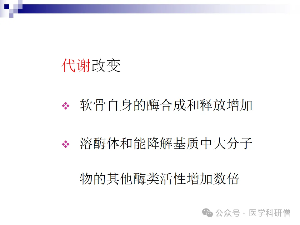 在骨关节炎的发病过程中,代谢改变也起着重要作用。软骨自身酶合成和释放的增加,以及溶酶体和其他酶类活性的增加,都导致了软骨基质的降解和关节软骨的进一步损害。这些代谢改变加剧了骨关节炎的病程,并使得治疗更加困难。因此,在治疗骨关节炎时,除了针对症状进行治疗外,还需要关注代谢改变的影响,并采取相应的治疗措施来纠正这些代谢异常。