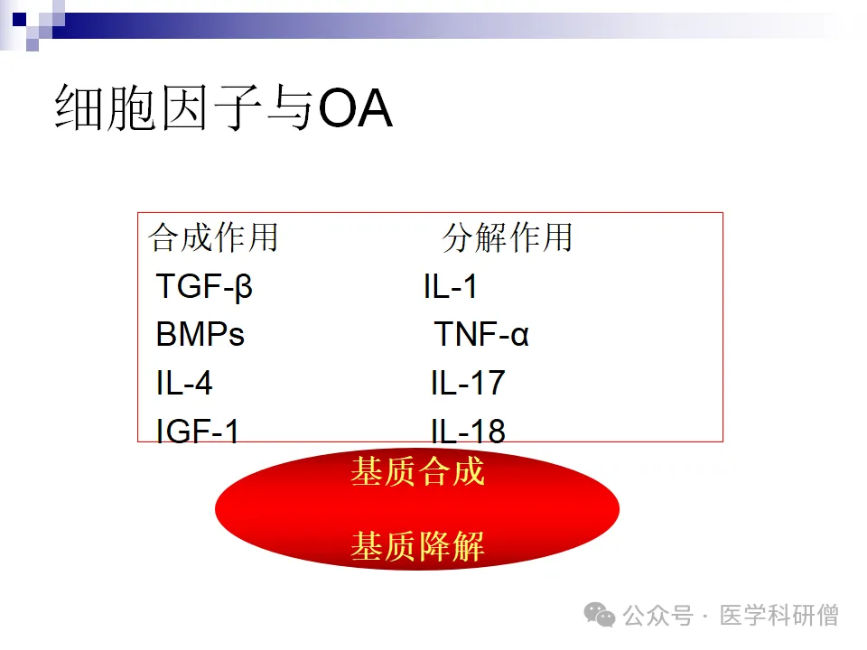 在骨关节炎(OA)的发病过程中,细胞因子的合成作用与分解作用之间的平衡被打破。其中,转化生长因子(TGF-β)、白细胞介素-1(IL-1)、骨形态发生蛋白(BMPs)和肿瘤坏死因子(TNF-α)等细胞因子起着关键作用。它们通过不同的机制影响关节软骨的代谢和结构,进一步推动OA的病程。