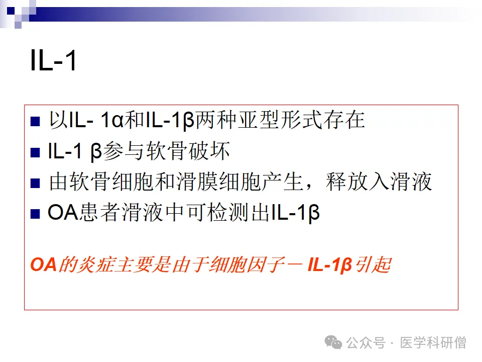 IL-1β是一种重要的细胞因子,它在OA的发病过程中起着关键作用。IL-1β主要由软骨细胞和滑膜细胞产生,并参与软骨的破坏过程。通过抑制软骨基质的合成并促进基质降解酶的释放,IL-1β加剧了关节软骨的损害。