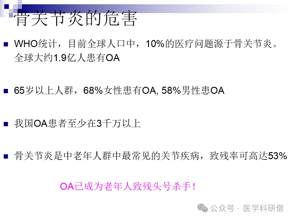 根据WHO的统计数据,骨关节炎是全球范围内导致人口健康受损和残疾的主要原因之一。它给患者带来了巨大的痛苦和经济负担,并严重影响了患者的生活质量和社会功能。