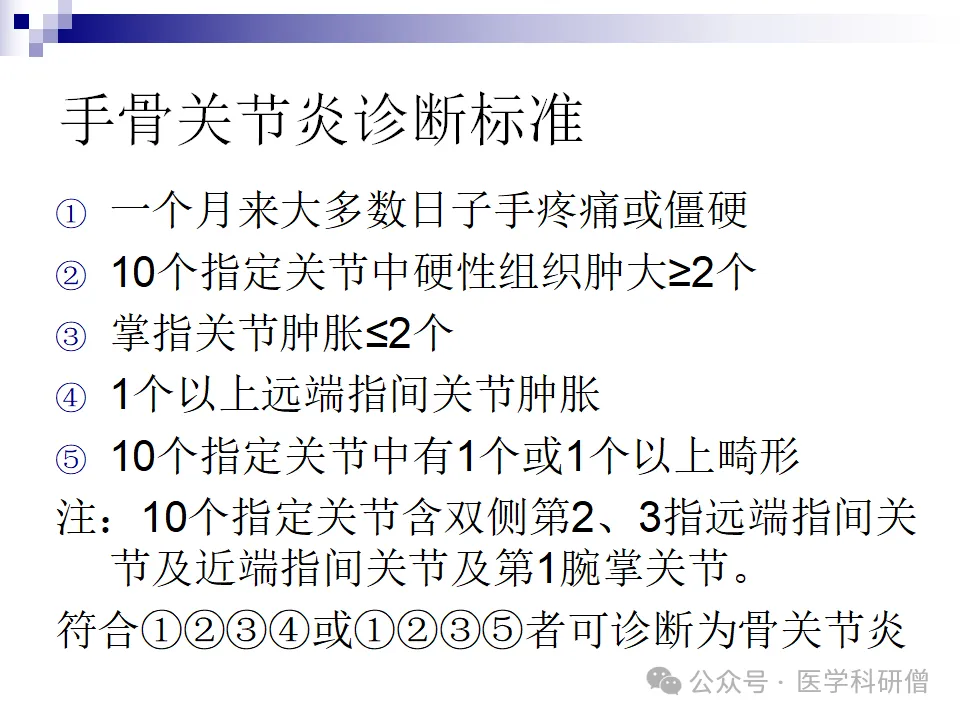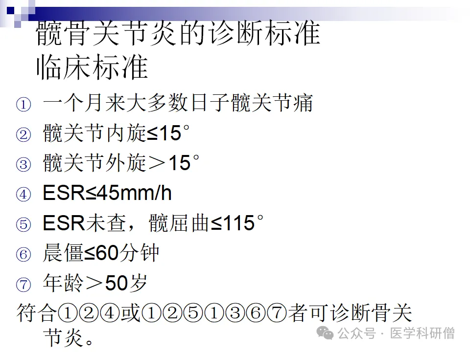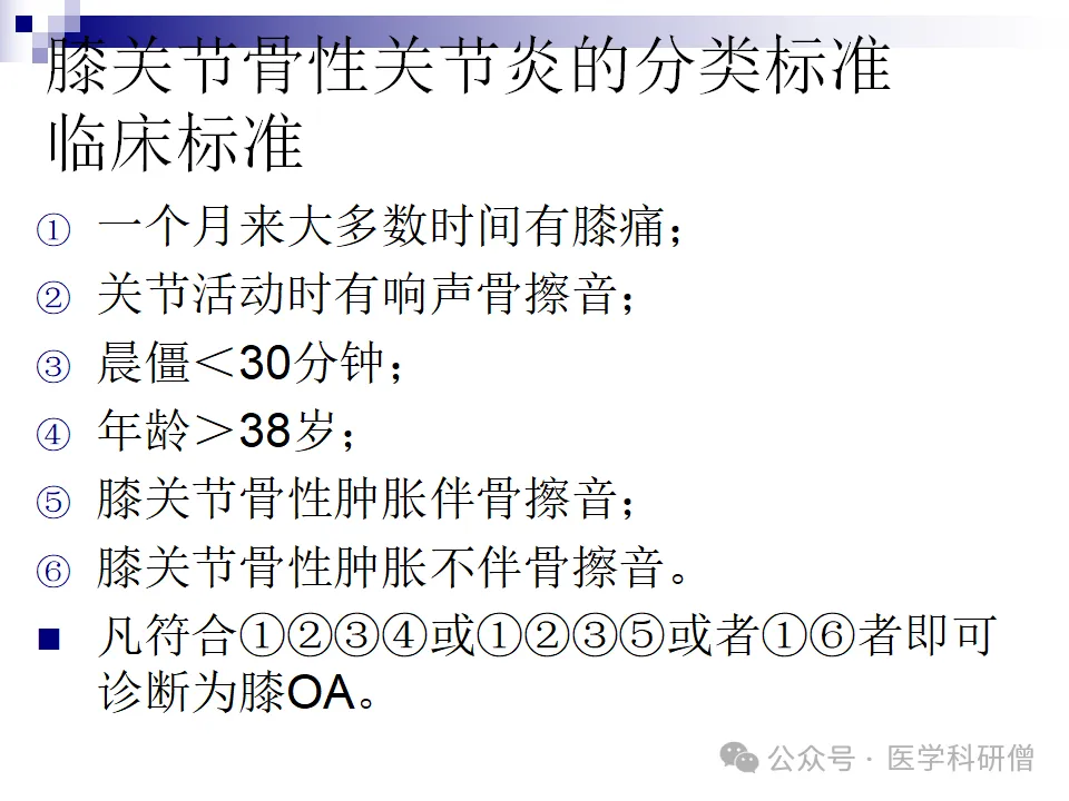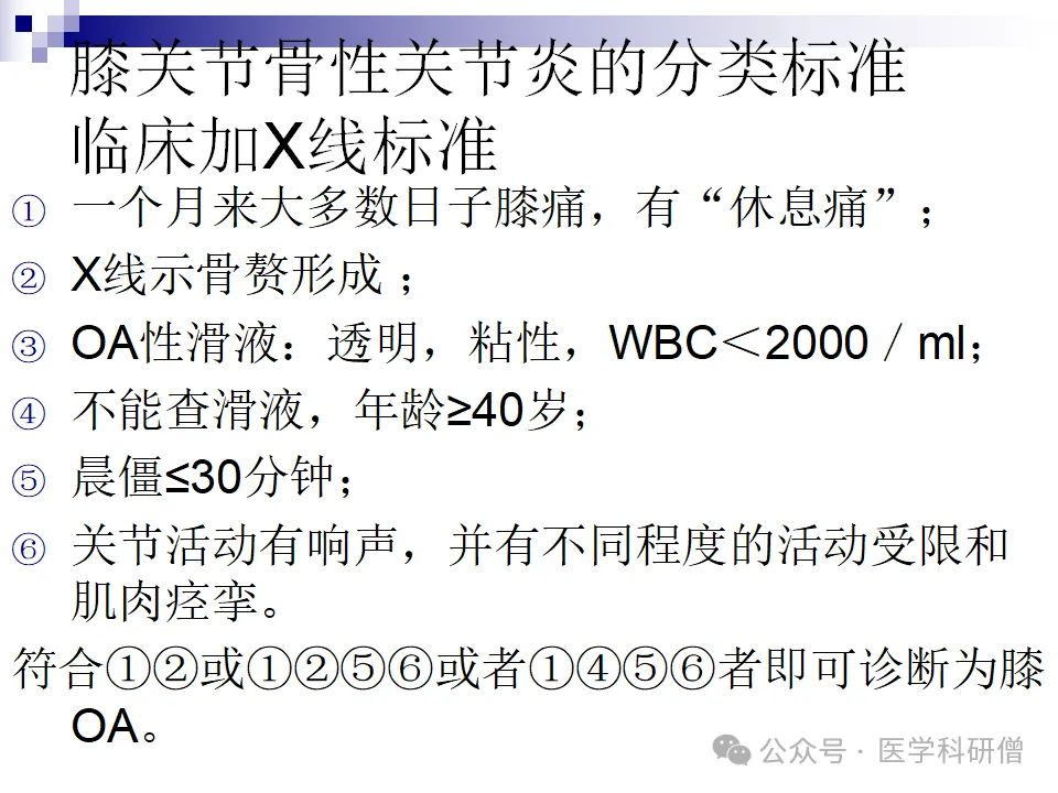 对于骨关节炎的诊断,存在针对膝关节、手部、髋关节等不同部位的具体分类标准。这些标准主要基于临床表现、X线表现以及实验室检查等结果,为医生提供了明确的诊断依据。