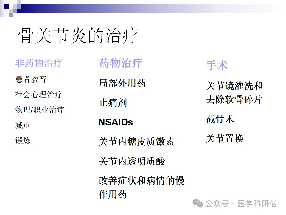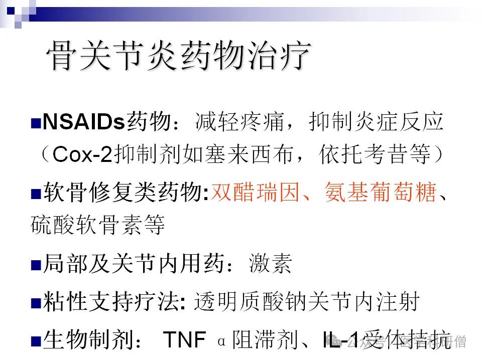 药物治疗是骨关节炎的常规治疗手段之一,包括非甾体抗炎药(NSAIDs)、局部外用药、止痛剂、关节内糖皮质激素以及关节内透明质酸等。这些药物主要通过抑制炎症和缓解疼痛来改善患者的症状。