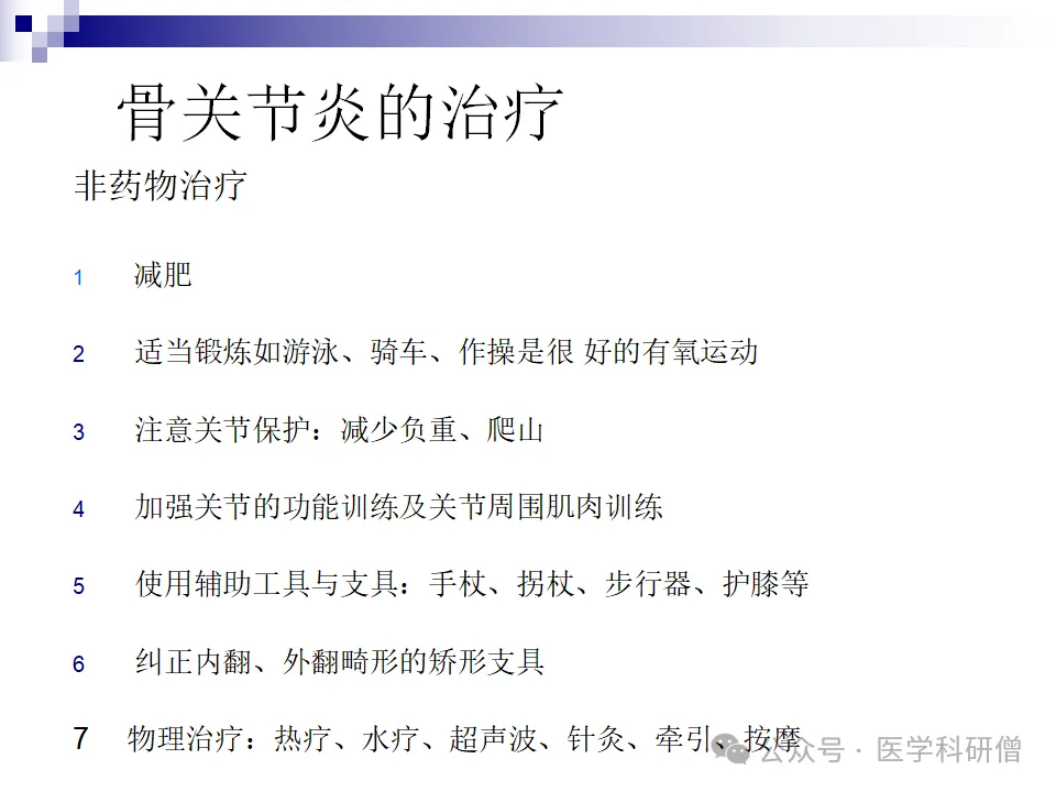 骨关节炎的治疗旨在缓解症状、改善关节功能并阻止或延缓关节的退变过程。治疗方法包括非药物治疗、药物治疗以及手术治疗等多种手段。