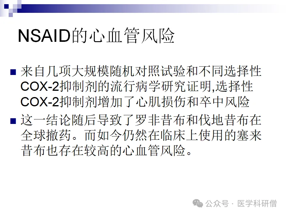 选择性COX-2抑制剂是一类常用的NSAIDs药物,但研究表明它们可能增加心肌损伤和卒中的风险。因此,在使用这类药物时需要谨慎评估患者的心血管状况。