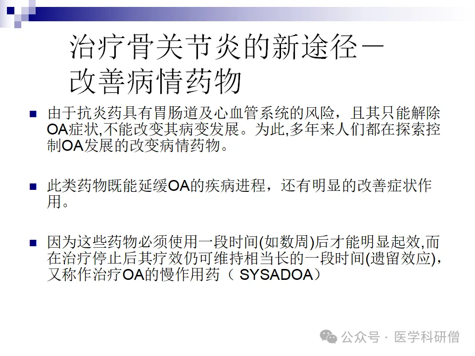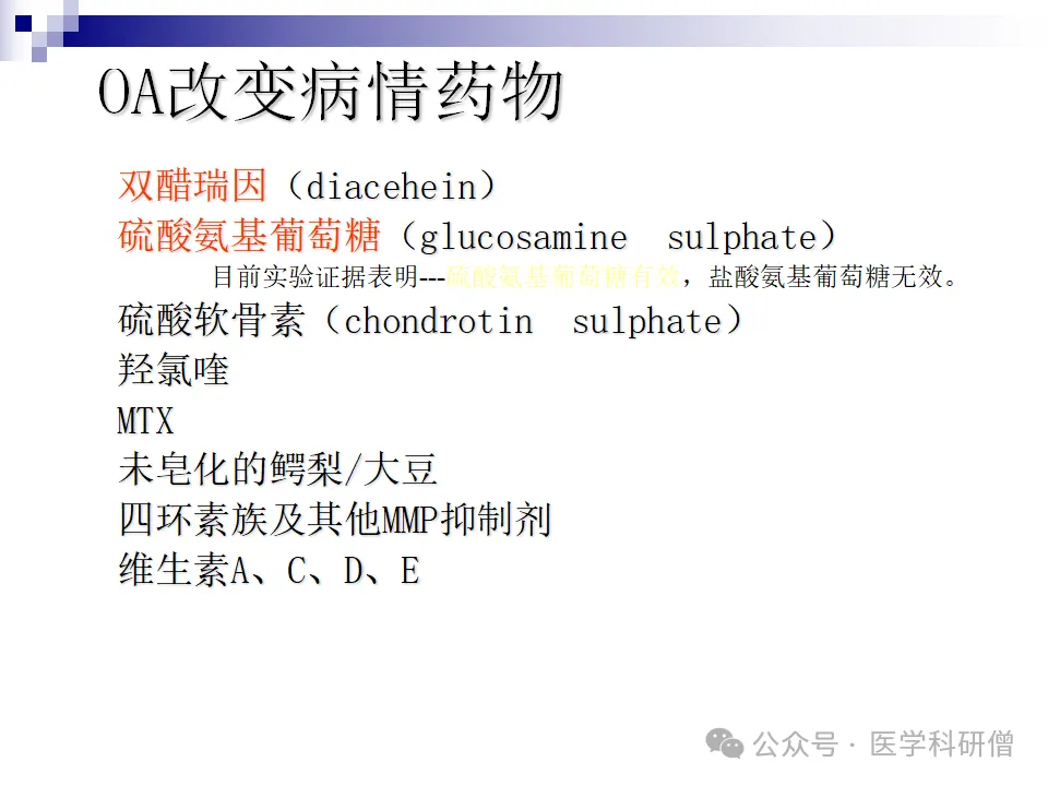 除了上述提到的双醋瑞因和硫酸氨基葡萄糖外,还有硫酸软骨素、羟氯喹、MTX、未皂化的鳄梨/大豆提取物、四环素族药物以及其他基质金属蛋白酶(MMP)抑制剂和维生素等也被用于OA的治疗,以改变病情进展。